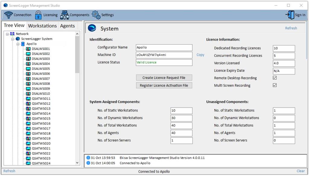 Workstations and servers are assigned to the system with simple drag & drop operations, up to the maximum licensed limits. Recording states and diagnostic information is displayed on the central ScreenLogger Management Studio.